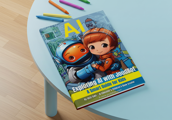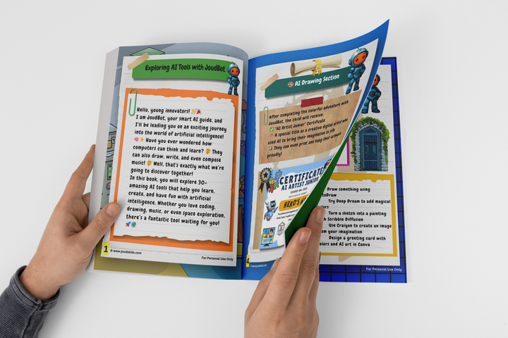is an interactive educational book designed for children ages 6â16 to learn about Artificial Intelligence in a fun and practical way. Guided by the friendly character JoudBot, kids explore amazing AI tools that help them draw, write, code, and compose music â all while building real-world creative skills.